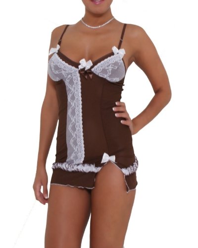 Nuisette sexy choco avec petit noeud, doublure en dentelle blanche sexy. Bretelle réglable. Composition: 90% Polyester - 10% Elasthane.