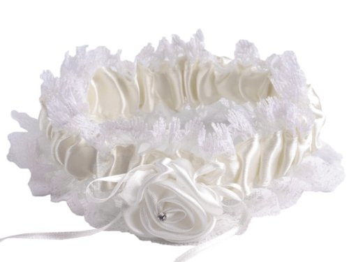 Cette petite jarretière en blanc d'une largeur de 6 cm en dentelle organza est décorée d'une rose satin avec petit cristal. Diamètre 11 cm, circonférence 34 cm (mesurée sans serrer), extensible jusqu'à 75 cm. 100% polyester.